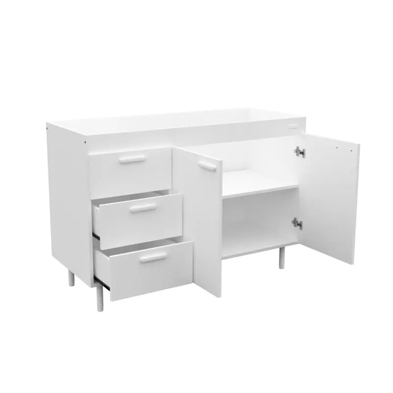 Bajo mesada fabricado en melamina de 15 mm de espesor, color blanco. Cuenta con 2 puertas, 3 cajones y 1 estante interno que ofrece amplio espacio de guardado. Incluye correderas metálicas y manijas plásticas grises. La cajonera puede armarse tanto a la derecha como a la izquierda, brindando mayor versatilidad. Fondo de cajones y mueble de 3 mm pintado en color blanco. No incluye bacha ni mesada. El producto se entrega desarmado.