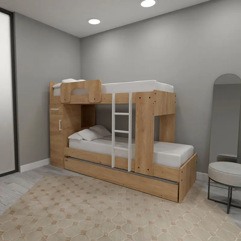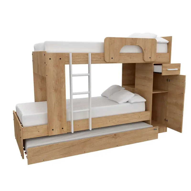 La Cama Cucheta Triliche en color Nebraska combina funcionalidad y estilo, ideal para optimizar dormitorios compartidos o espacios reducidos. Su diseño moderno y resistente permite alojar tres camas en un solo mueble, manteniendo el ambiente ordenado y práctico.