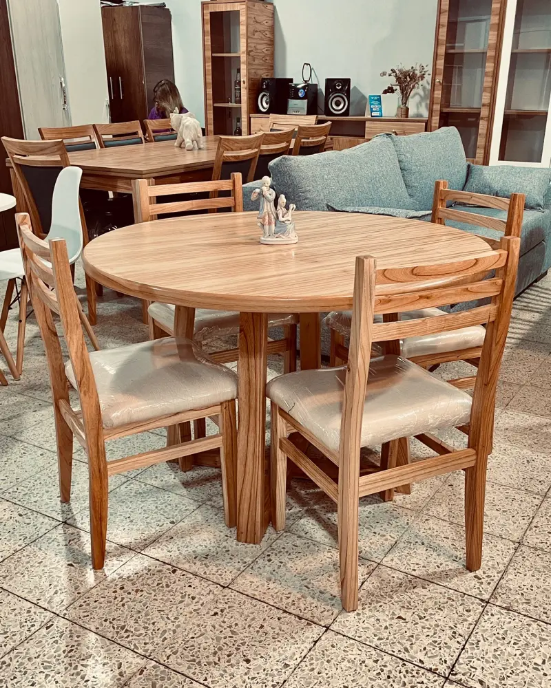 Aporta calidez y elegancia a tu comedor con esta mesa redonda de madera paraíso. Su diseño atemporal y natural la convierte en el centro perfecto para reuniones familiares o encuentros con amigos.