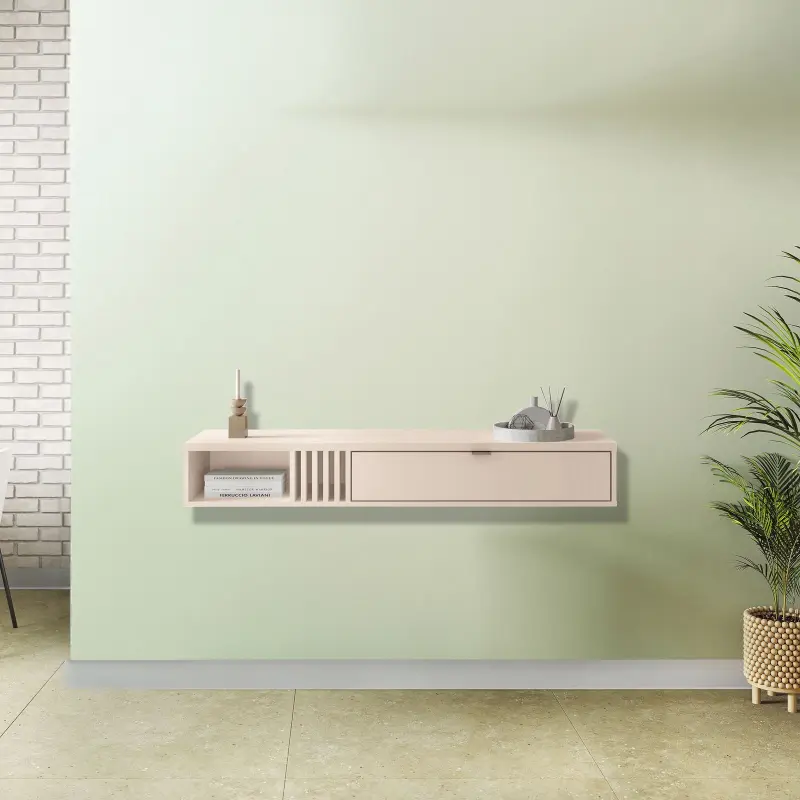 Cuenta con un amplio cajón con correderas suaves y un nicho abierto con divisores verticales, perfecto para libros o elementos decorativos.