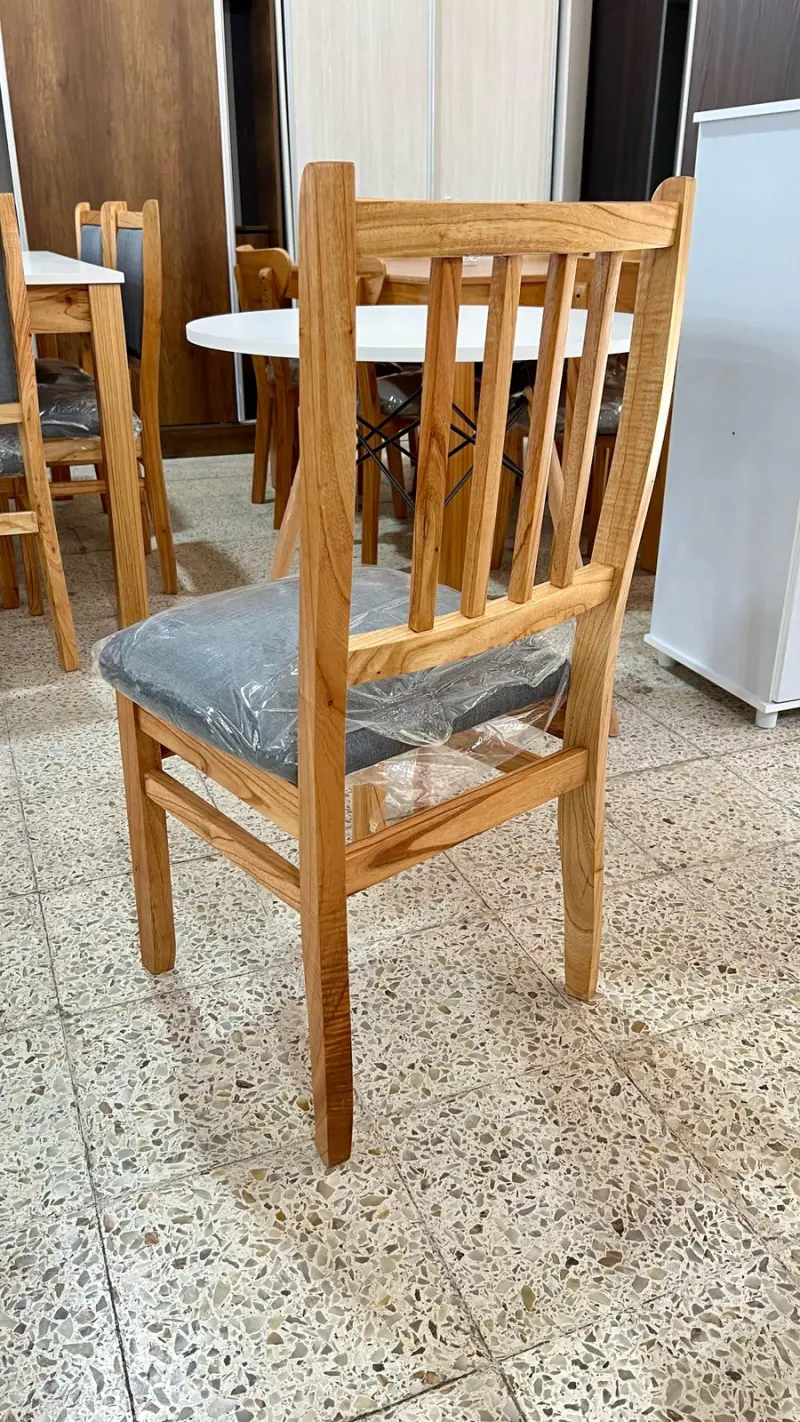Silla modelos ELISA🪑 fabricada en madera paraíso PREMIUM laqueado y tapizada en tela anti desgarro lavable✅. Respaldo 100% ergonómico y estructura con escopladuras (no tarugada), silla de primera calidad.