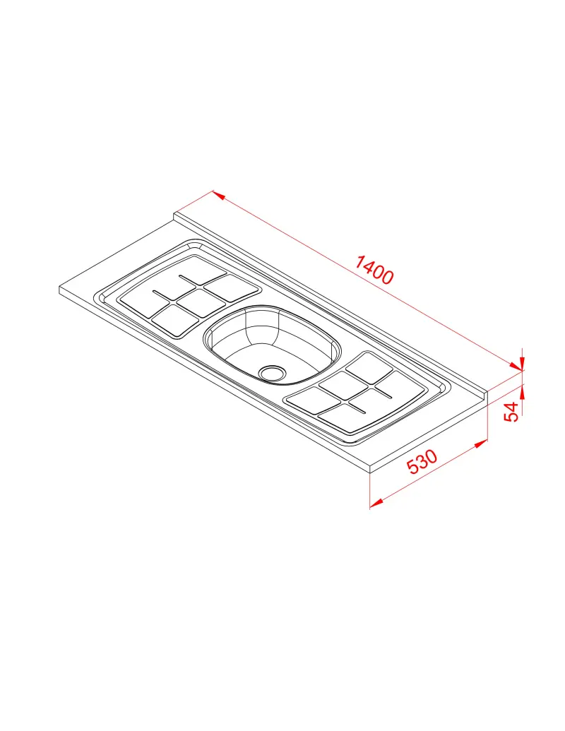 Bacha de acero inoxidable con escurridor y pileta ovalada central adaptable a las bajo mesadas. La grifería deben ser puestos en pared. Posee un tapon para el drenaje con su tapa correspondiente. Medidas Ancho 141 cm - profundidad 53cm - bacha central.