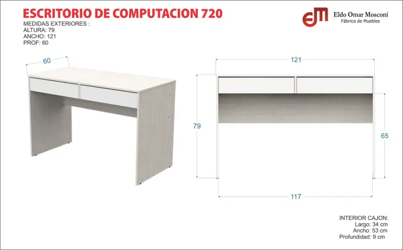 ESCRITORIO DE COMPUTACIÓN 2 cajones - 120x60x77 cm - Melamina 15mm - Colores Venezia con frente blanco