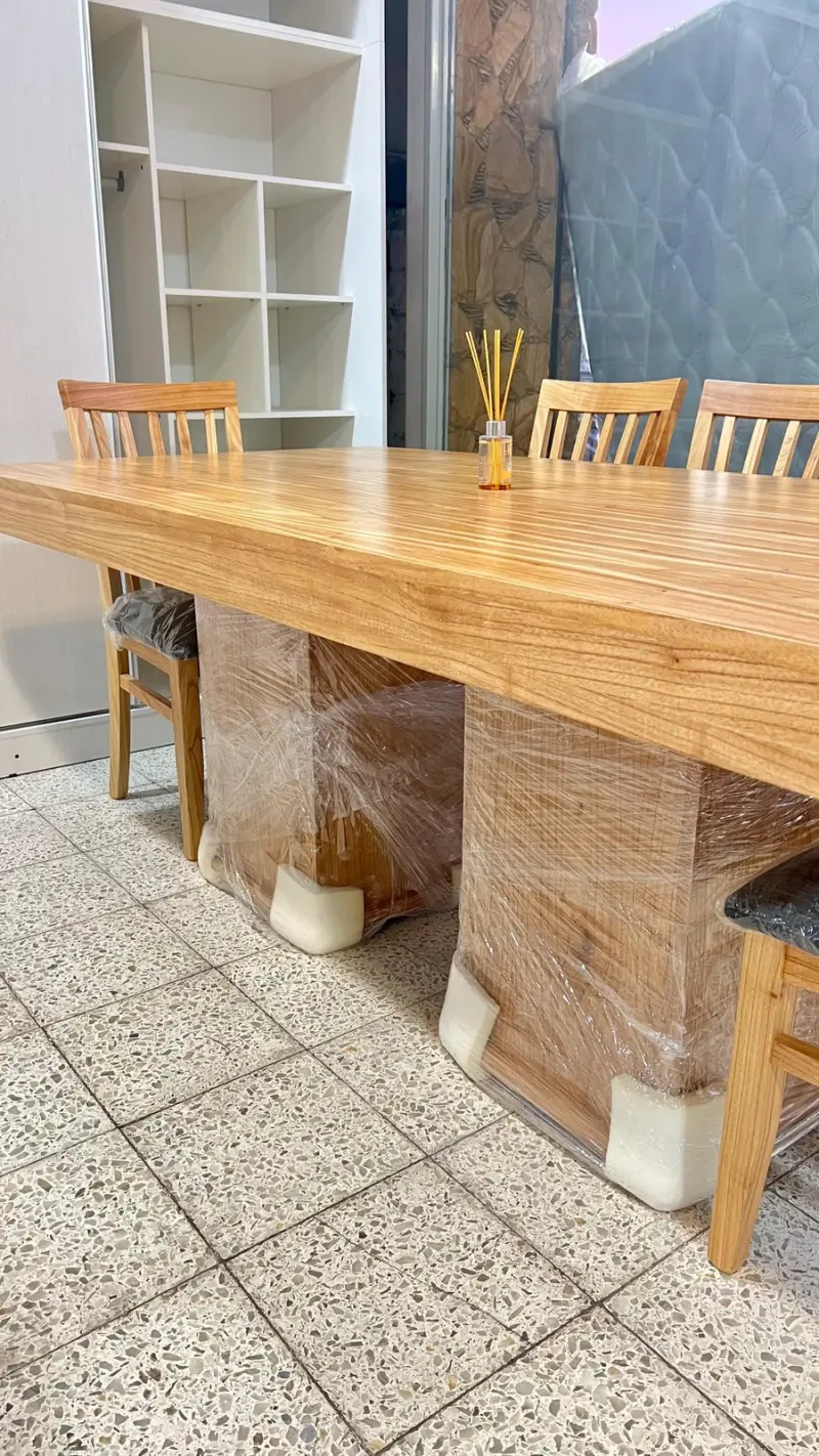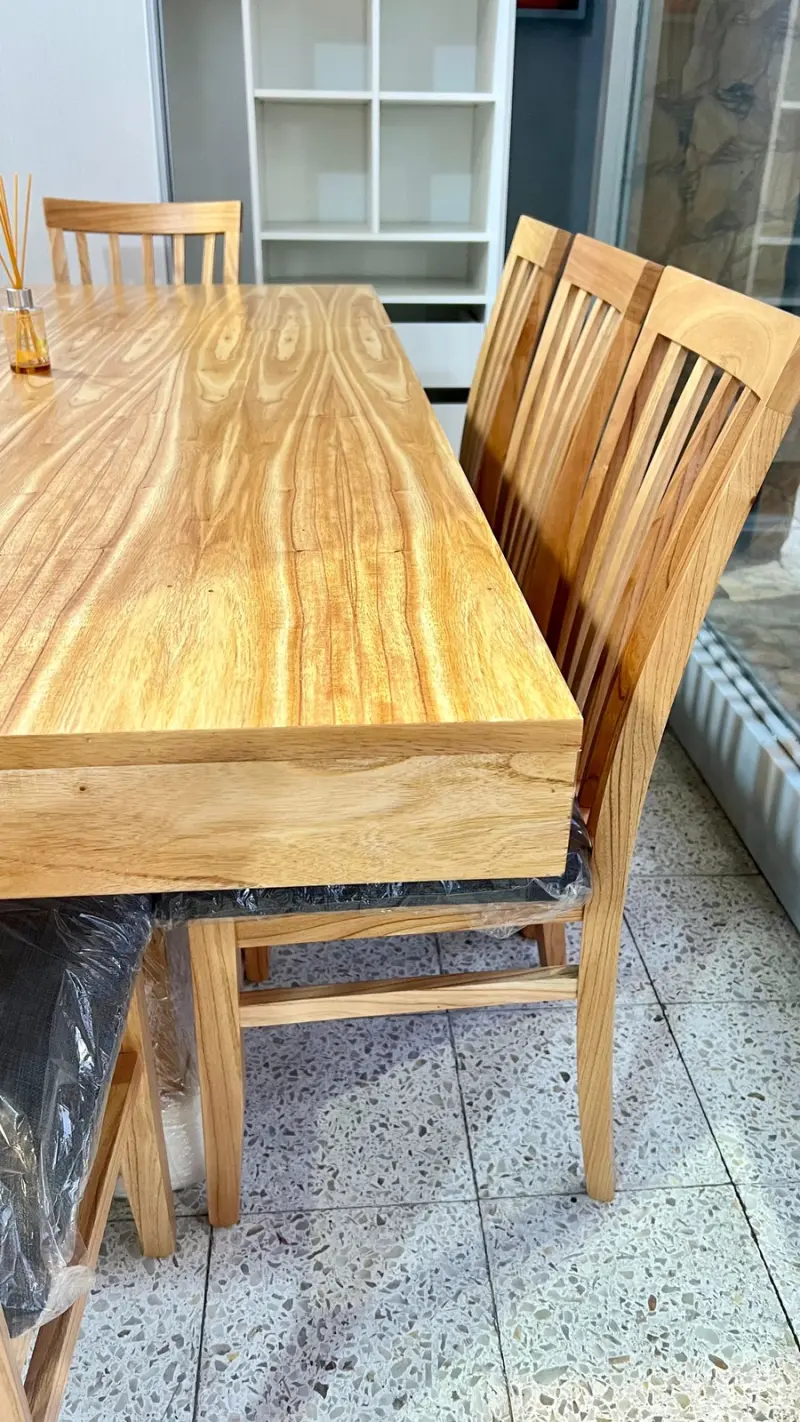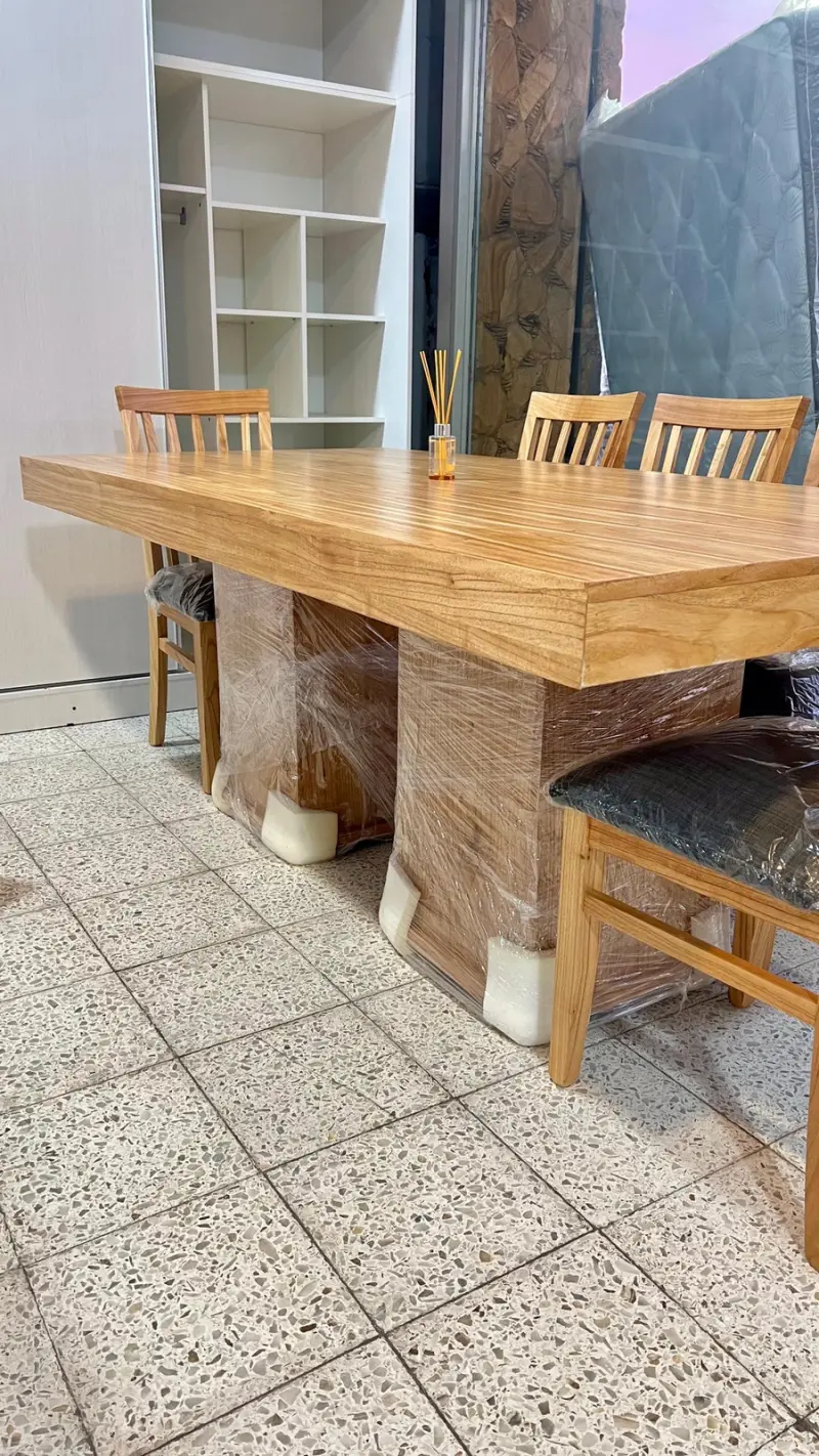 Esta imponente mesa de madera paraíso maciza, con doble base central, combina diseño elegante, firmeza y calidad premium.