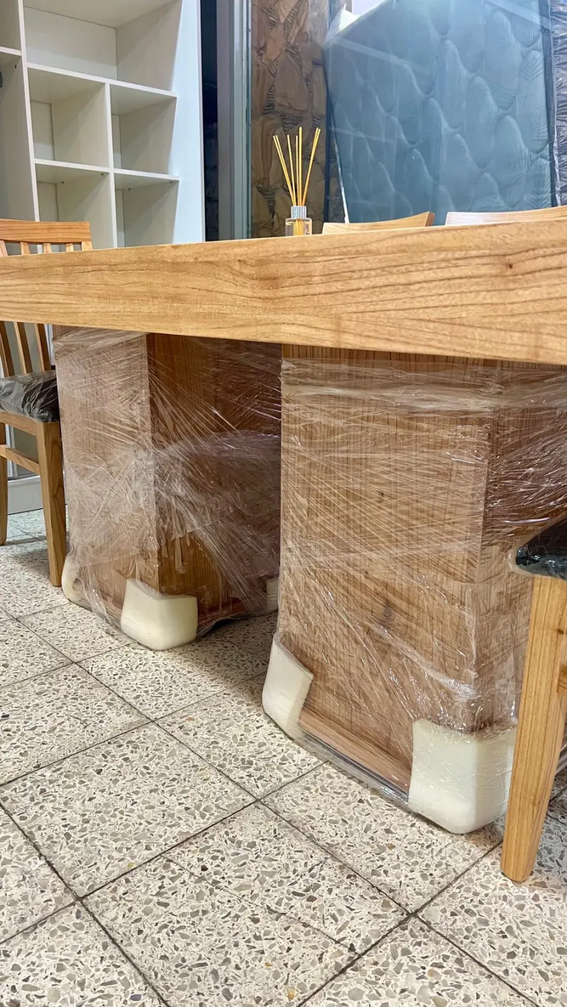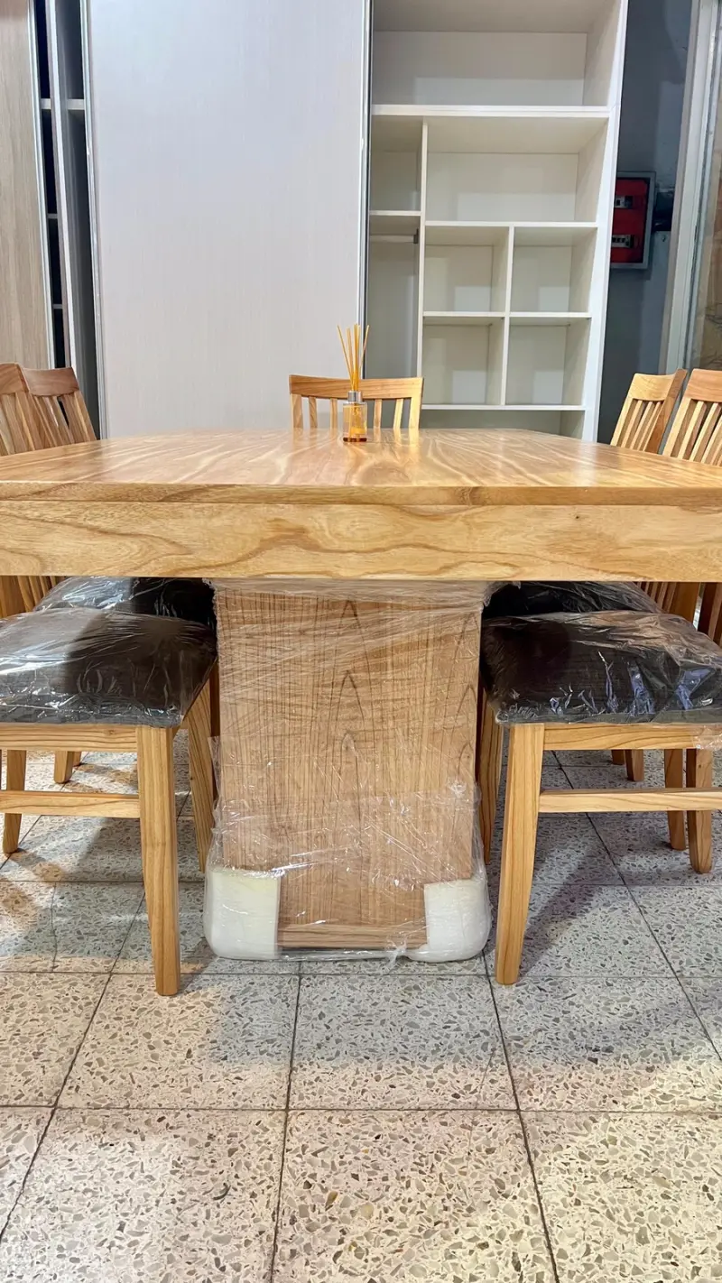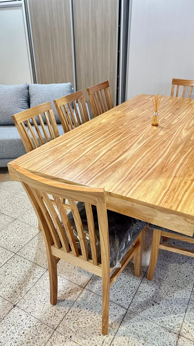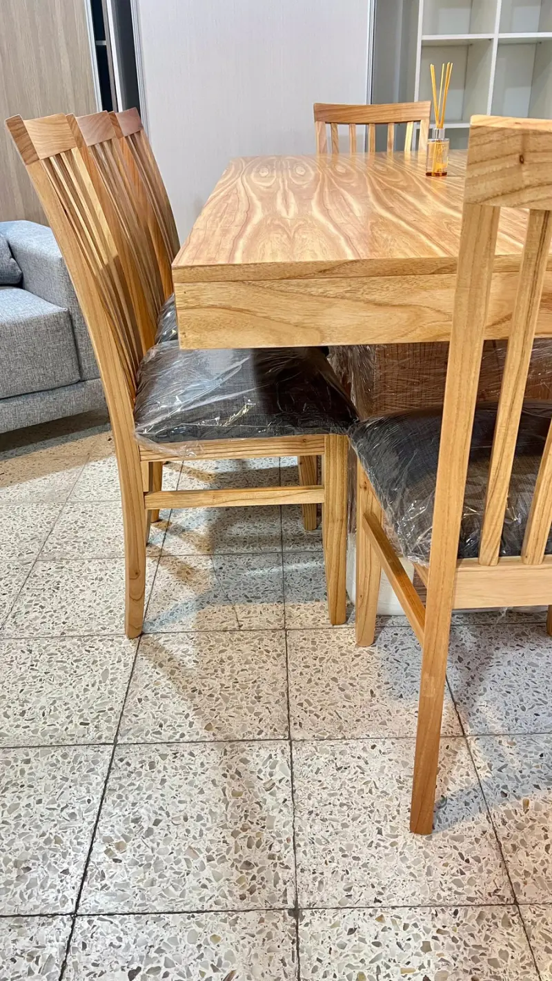 Esta imponente mesa de madera paraíso maciza, con doble base central, combina diseño elegante, firmeza y calidad premium.