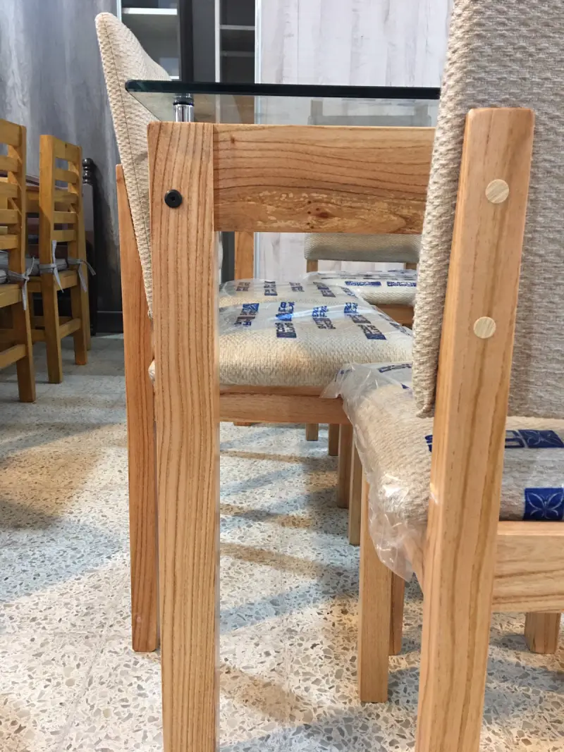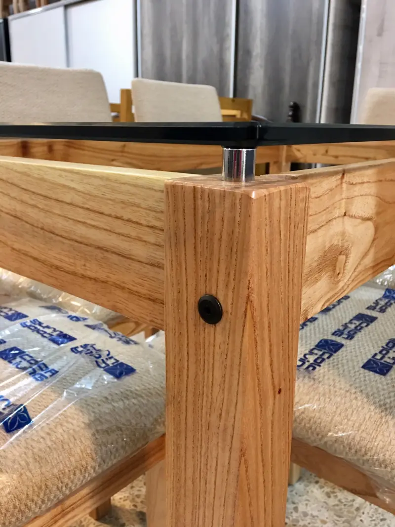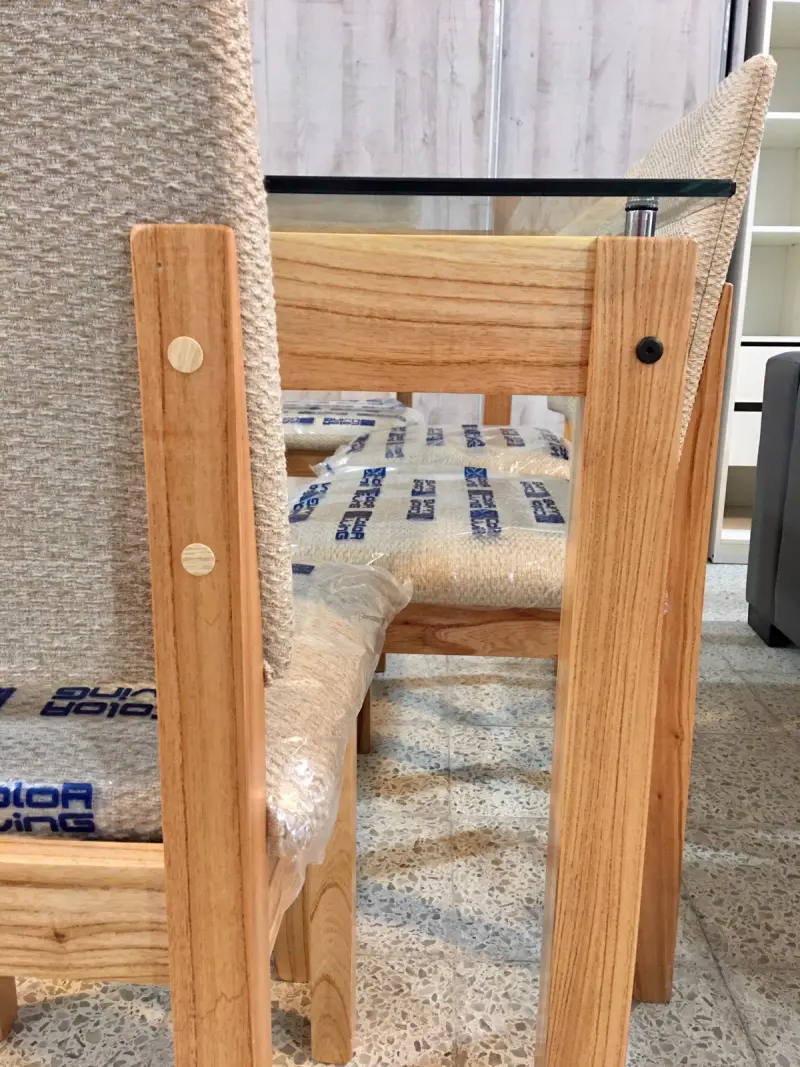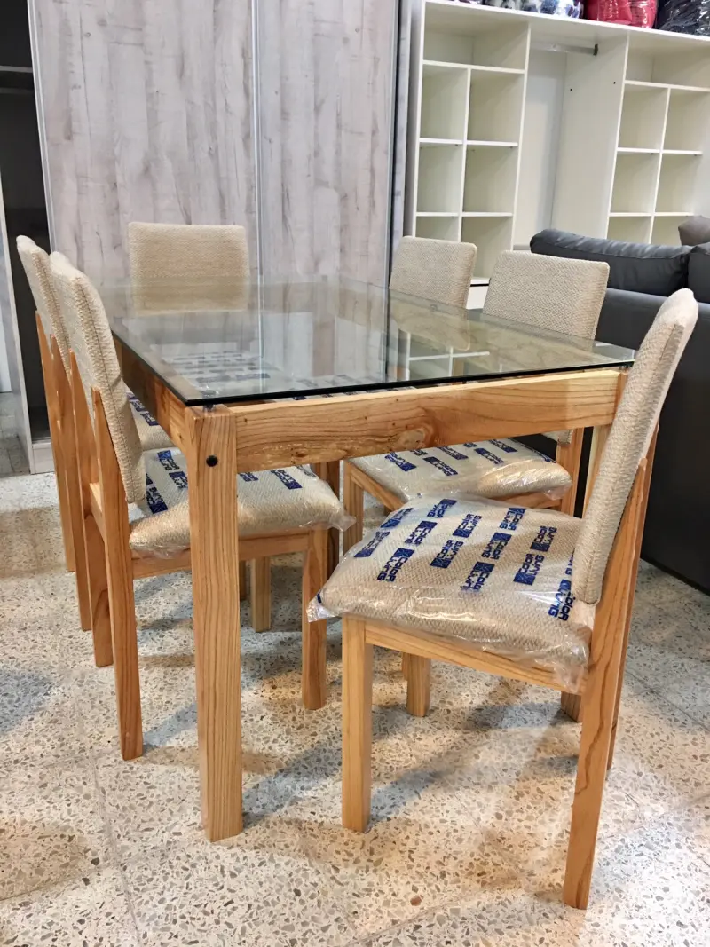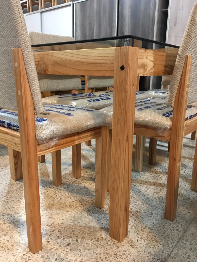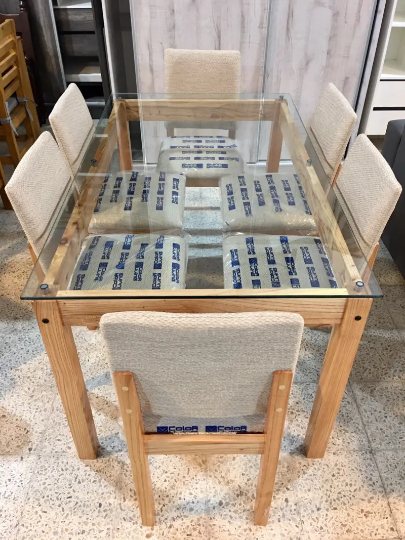Elegancia y resistencia se combinan en esta mesa de madera paraíso con tapa de vidrio templado, ideal para darle un toque moderno y sofisticado a tu comedor.