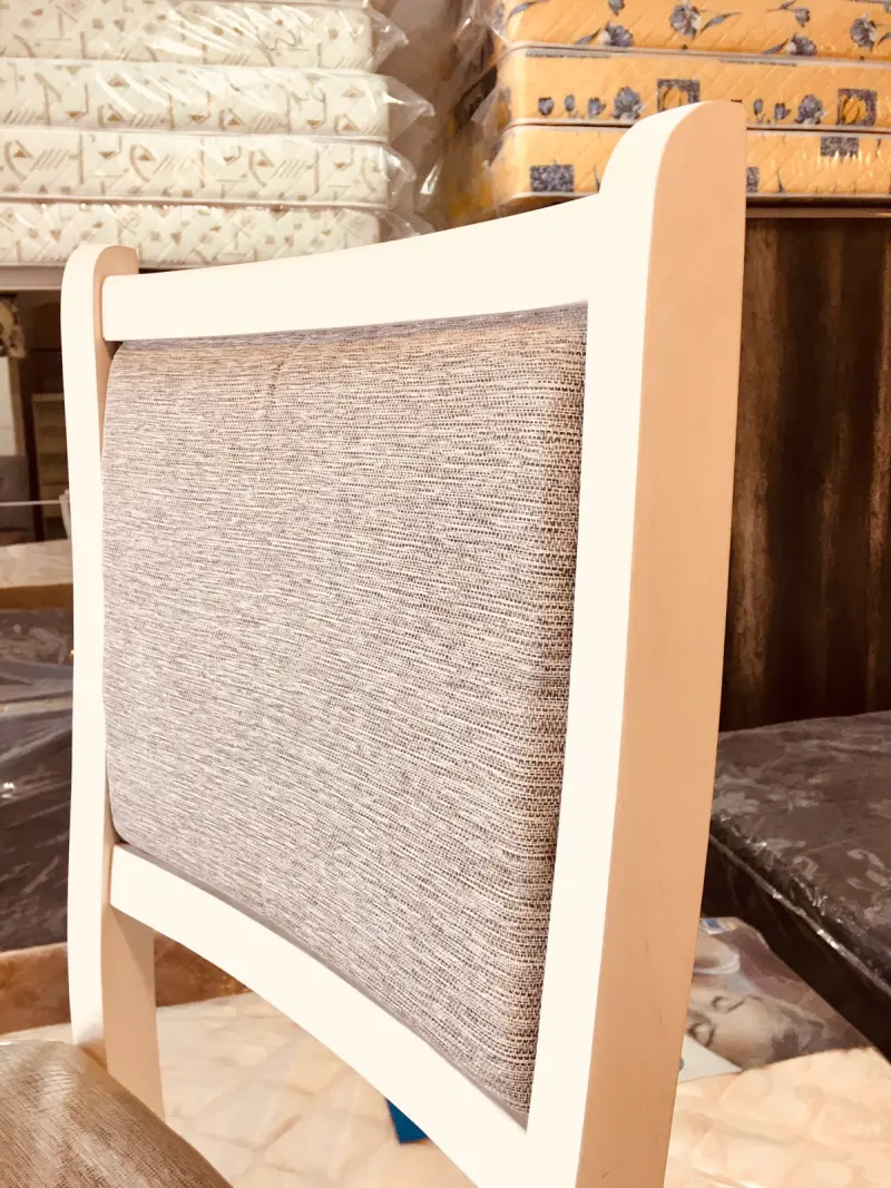 Silla modelos OLIVIA BLANCA🪑 fabricada en madera paraíso PREMIUM laqueado y tapizada en tela anti desgarro lavable✅. Respaldo 100% ergonómico y estructura con escopladuras (no tarugada).