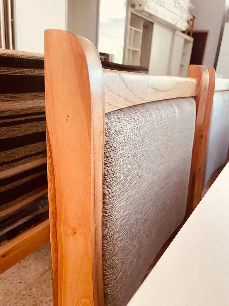 Silla modelos OLIVIA🪑 fabricada en madera paraíso PREMIUM laqueado y tapizada en tela anti desgarro lavable✅. Respaldo 100% ergonómico y estructura con escopladuras (no tarugada).